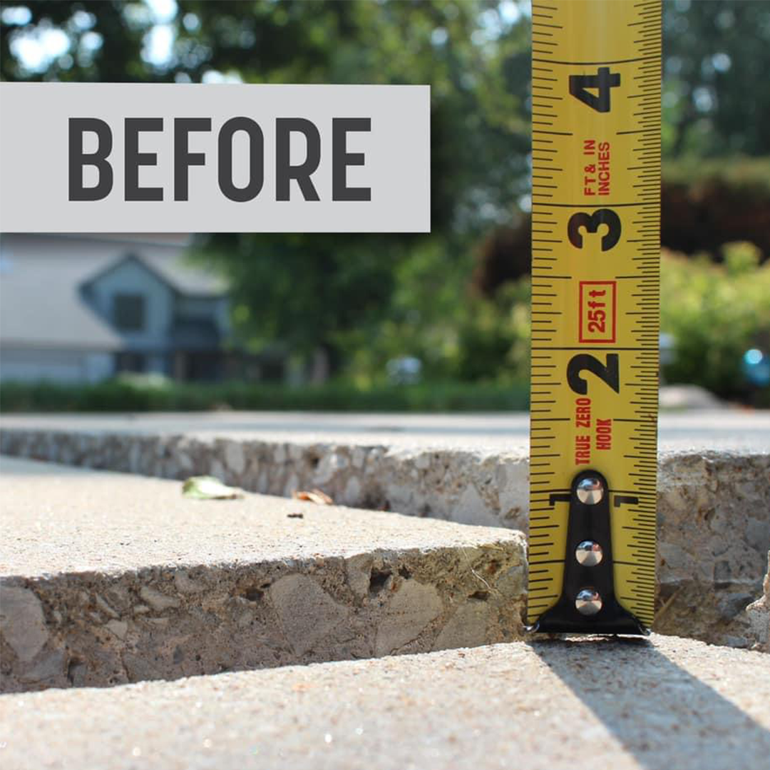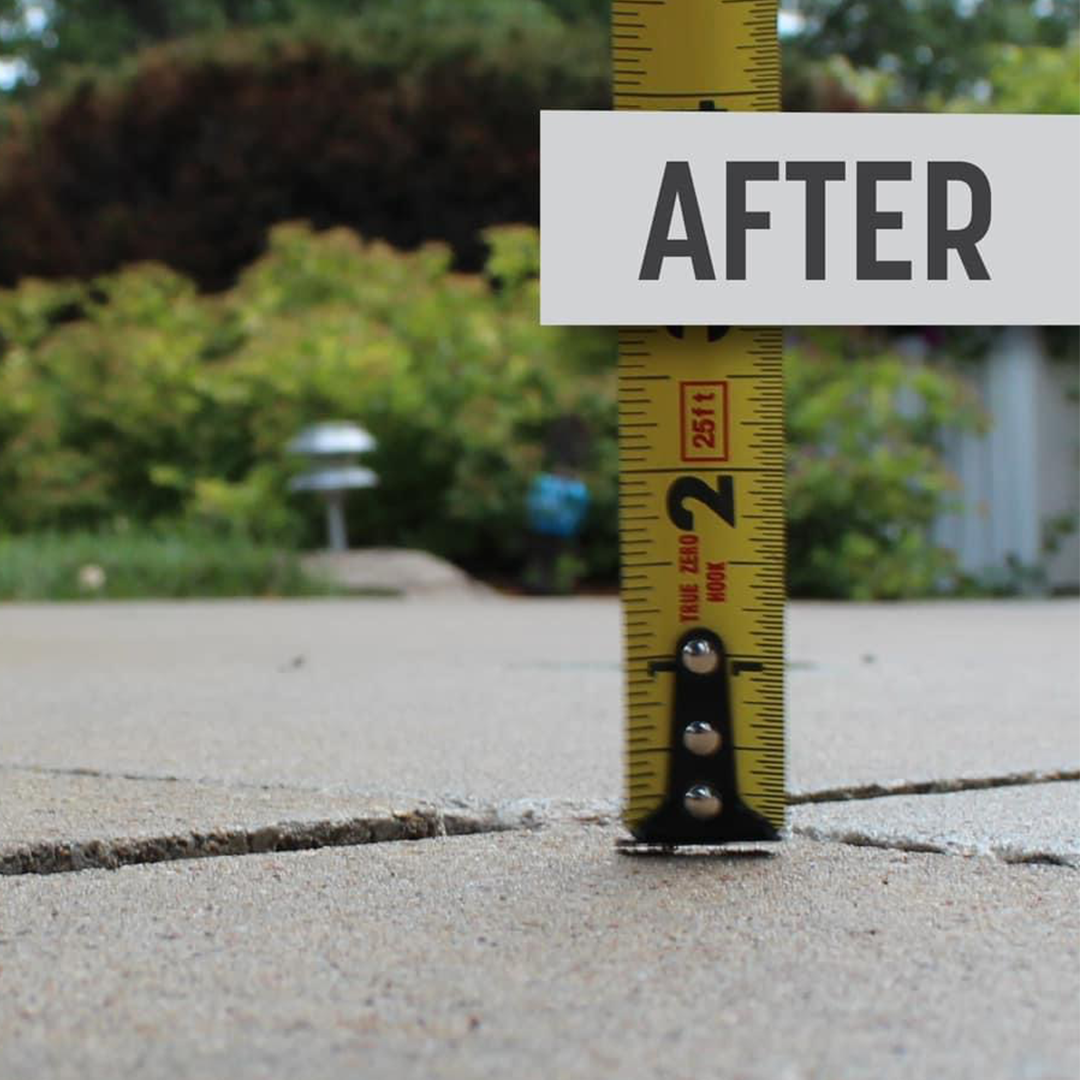 Polyurethane concrete raising requires nearly invisible 5/8” holes (the size of a dime) drilled, and the process calls for considerably fewer holes than traditional mud jacking. Minimal patchwork is needed.